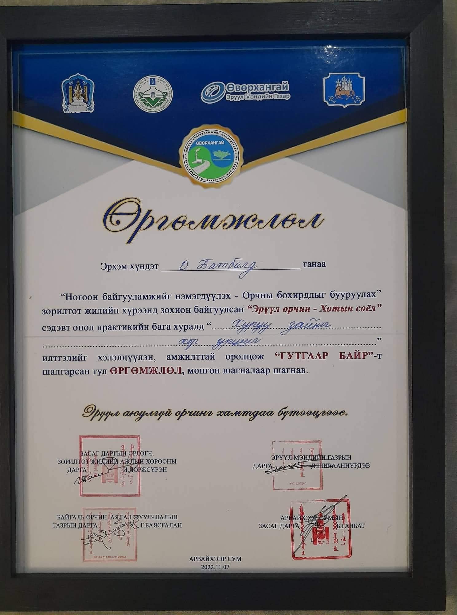 Өвөрхангай аймгийн ЗДТГ, Эрүүл мэндийн газар, Байгаль орчин аялал жуулчлалын газар, Арвайхээр сумын ЗДТГазраас хамтран зохион байгуулсан "Ногоон байгууламжийг нэмэгдүүлэх-Орчны бохирдлыг бууруулах" зорилтот жилийн хүрээнд зохион байгуулагдсан "ЭРҮҮЛ ОРЧИН- ХОТЫН СОЁЛ" сэдэвт илтгэлийн уралдаанд Нийгмийн ухааны заах аргын нэгдлийн хамт олон АМЖИЛТТАЙ оролцож ГУТГААР БАЙР эзэллээ.